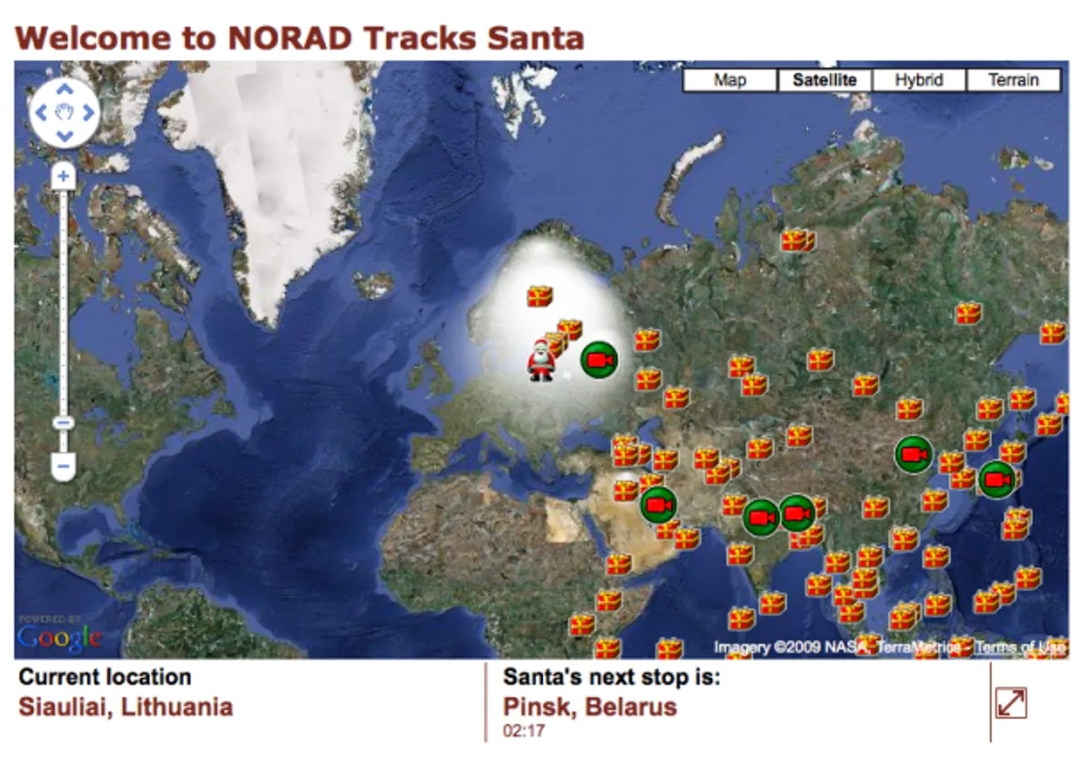 Desde hace 70 años, fuerzas militares de Estados Unidos y Canadá rastrean cada 24 de diciembre el viaje de Santa, quien inicia su recorrido en Nueva Zelanda y Australia, donde anochece primero, para luego continuar por Asia, África y Europa, antes de finalizar en el continente americano.